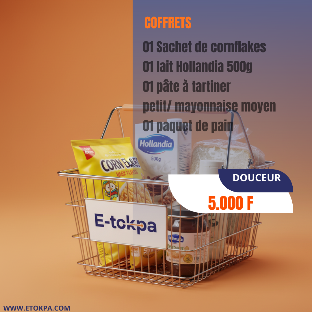 Le coffret Céréales & Douceur réunit tout ce qu’il faut pour un petit-déjeuner simple et gourmand. Vous avez un sachet de cornflakes, un lait Hollandia 500g, une pâte à tartiner petit format et une mayonnaise moyenne. Un pack pratique pour la maison, les bureaux ou pour ravitailler vos clients rapidement sans prise de tête.